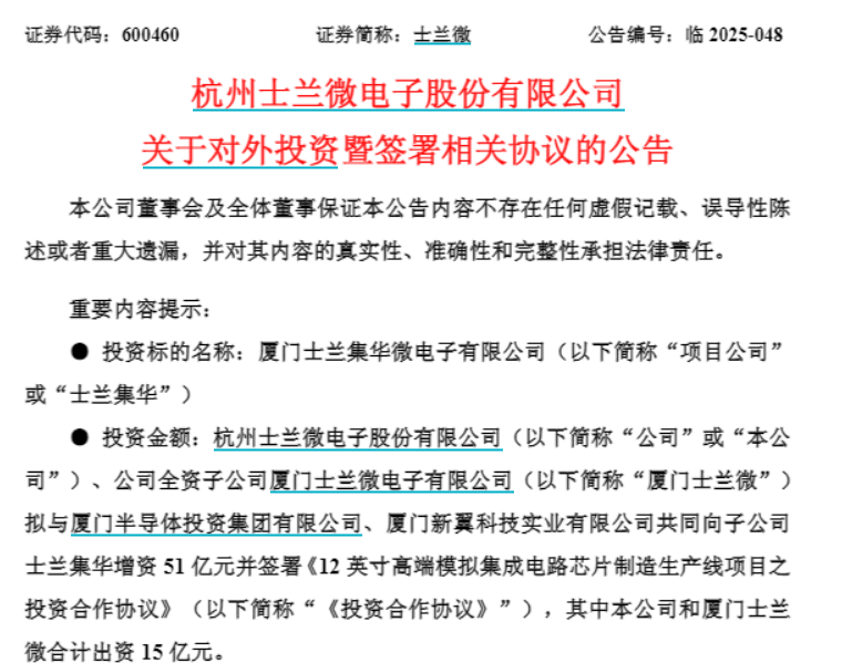 10月19日,杭州士蘭微電子股份有限公司發(fā)布公告稱,擬投資建設(shè)“12英寸高端模擬集成電路芯片制造生產(chǎn)線項(xiàng)目”,同時(shí)公司及子公司廈門士蘭微電子有限公司擬與廈門半導(dǎo)體投資