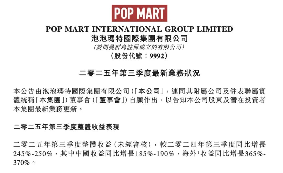 公告顯示,2025年第三季度,泡泡瑪特整體收益同比增長245%~250%,其中中國市場收益同比增長185%~190%,海外市場收益同比增長365%~370%。