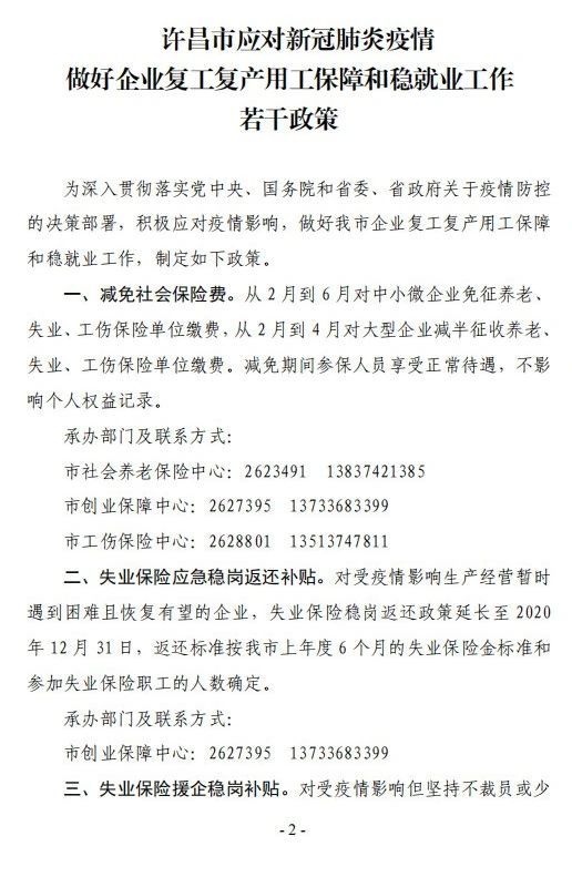 大河財(cái)立方消息 2月24日,許昌市發(fā)布《許昌市應(yīng)對新冠肺炎疫情做好企業(yè)復(fù)工復(fù)產(chǎn)用工保障和穩(wěn)就業(yè)工作若干政策的通知》。