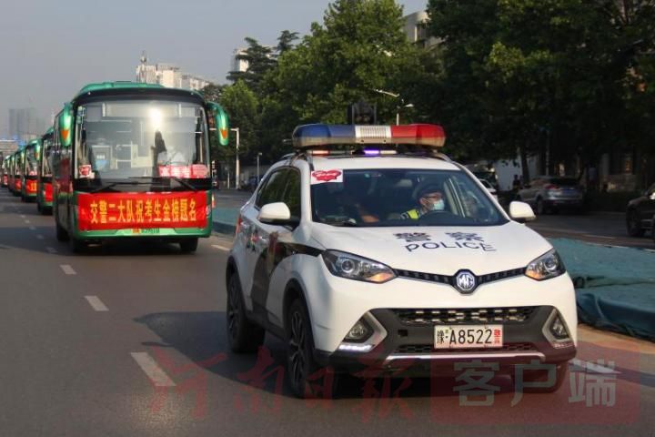 高考期間,鄭州市二七區(qū)馬寨鎮(zhèn)公安路上的澍青醫(yī)學(xué)??茖W(xué)校出動39輛大巴車,載著考生分別到鄭州73中、國防科技學(xué)校和興華街小學(xué)集中乘車參加高考,鄭州市交警二大隊(duì)安排警用汽車和摩托車在大巴車前方實(shí)施滾動警衛(wèi),為考生車隊(duì)警車開道。