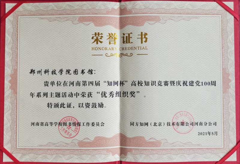 近日,從河南省第四屆“知網杯”高校知識發(fā)現(xiàn)有獎競賽河南賽區(qū)組委會傳來消息,鄭州科技學院圖書館榮獲“優(yōu)秀組織獎”,王文華、單佳、王曉夢等28位同學榮獲省賽“卓越個人獎”。