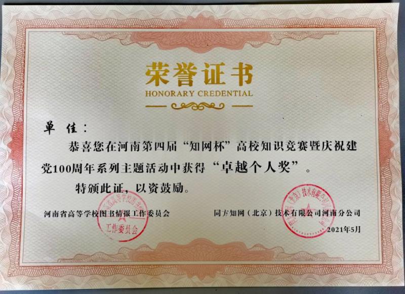 據了解,此次比賽由中國知網河南分公司聯(lián)合河南省高等學校圖書情報工作委員會以及河南省內各大高校共同開展,大賽歷時一個月,比賽以網上報名參賽答題的形式進行,河南省近百家高校參與,參賽人數(shù)近3萬人。鄭州科技學院共有1500名師生踴躍參與,最終28位學生獲獎。