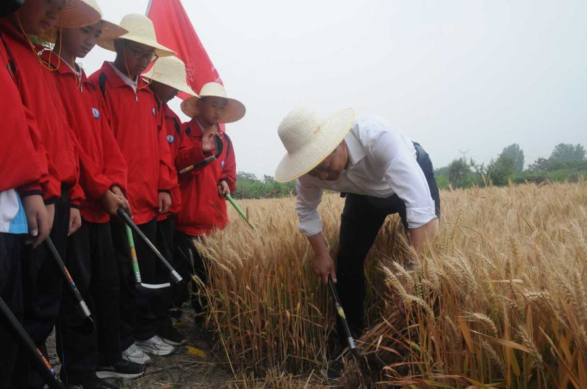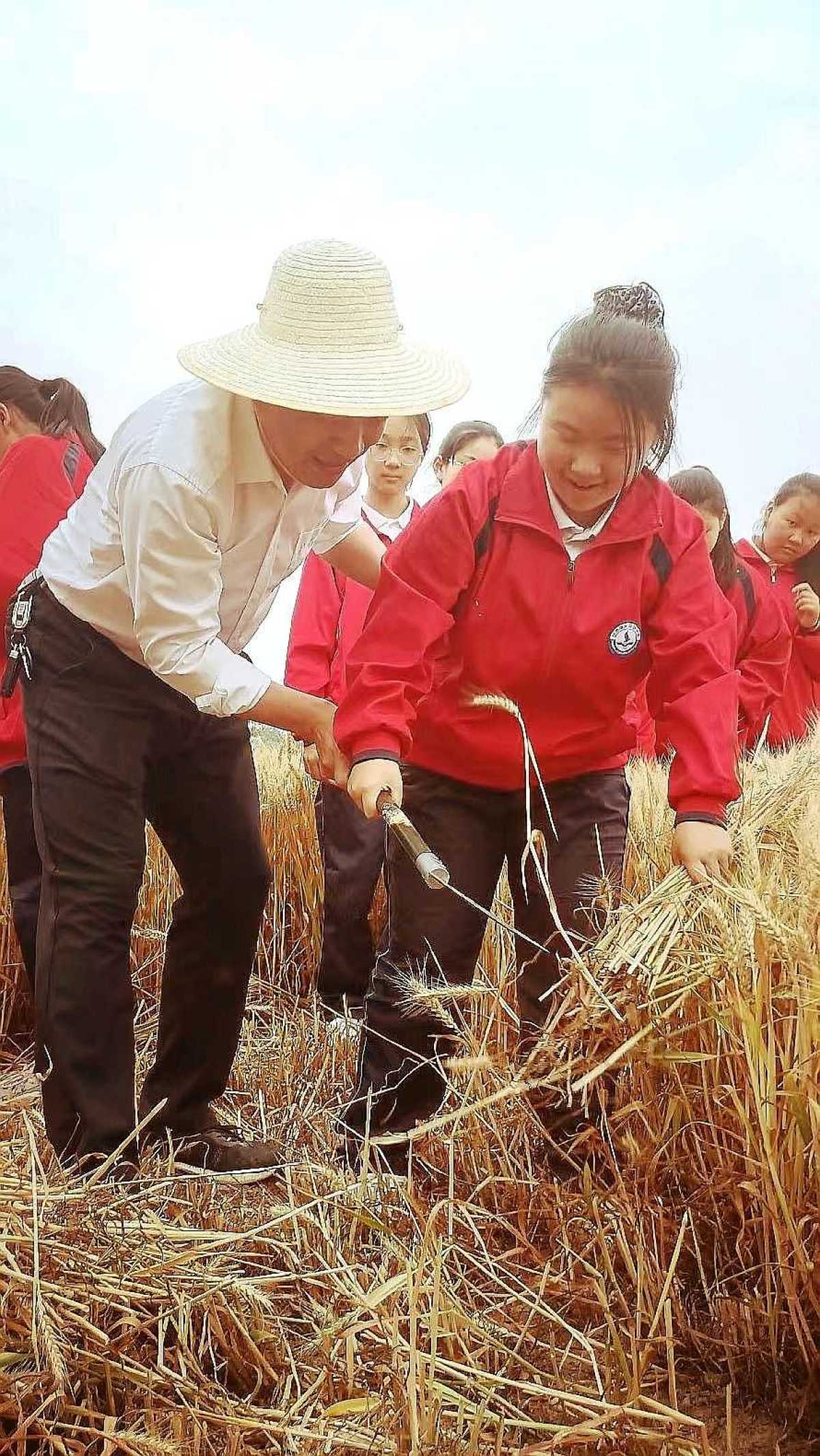校長(zhǎng)孫群杰教學(xué)生用鐮刀割麥,體驗(yàn)勞動(dòng)的辛苦和收獲的不易。