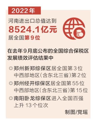2022年,河南進(jìn)出口總值在高基數(shù)上穩(wěn)定增長(zhǎng),達(dá)到8524.1億元,居全國(guó)第9位。其中,鄭州新鄭、鄭州經(jīng)開、南陽(yáng)臥龍、洛陽(yáng)四個(gè)綜保區(qū)對(duì)全省進(jìn)出口總值的貢獻(xiàn)率超60%。