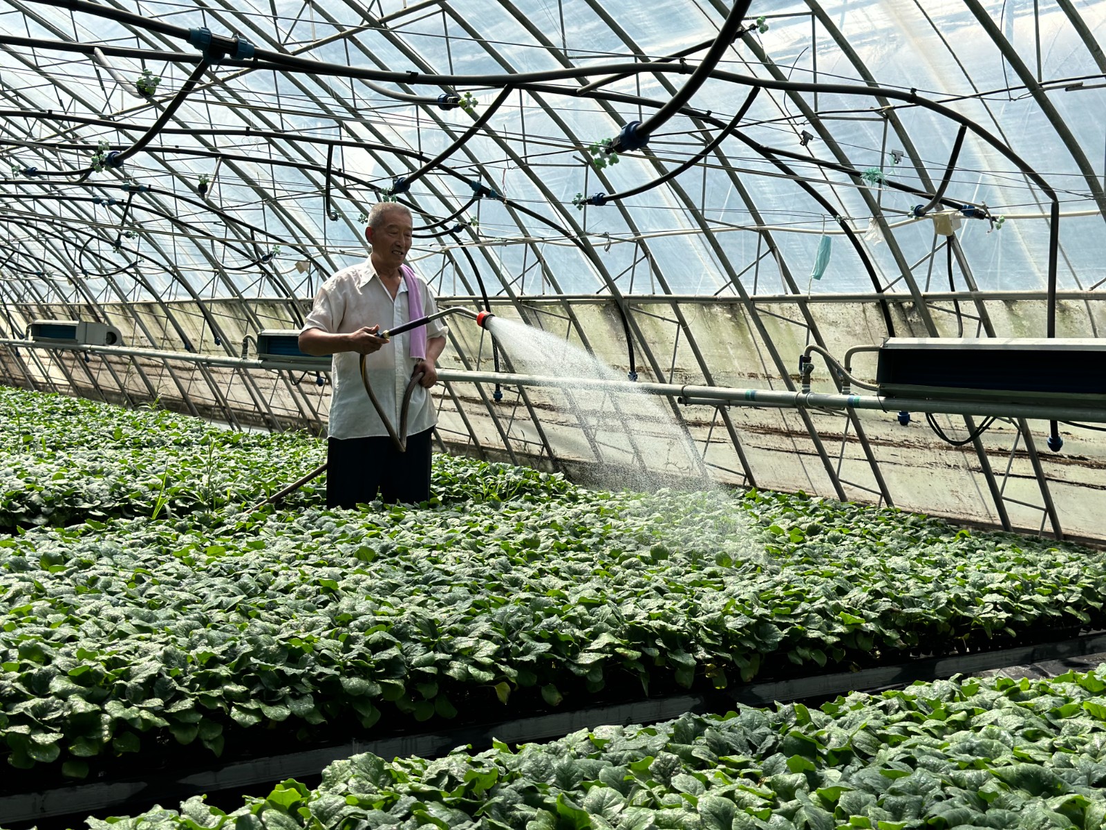 大河網(wǎng)訊 (記者 朱麗文 實習(xí)生 王璐瑤)早上8點,河南省濮陽市南樂縣??版?zhèn)馬村現(xiàn)代化農(nóng)業(yè)產(chǎn)業(yè)基地的西瓜育秧大棚里,70歲的老楊正為一排排的西瓜秧噴水,他自己都沒想到,這個年紀(jì)能在家門口“上班”。