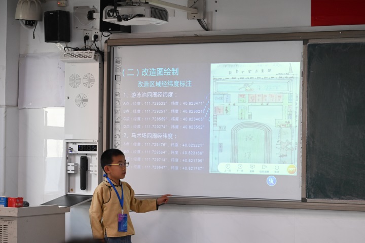 來自內蒙古呼和浩特市賽罕區(qū)巨華小學三年級的吳嵐天分享了他參賽作品:北斗創(chuàng)造游泳騎馬特色校園。