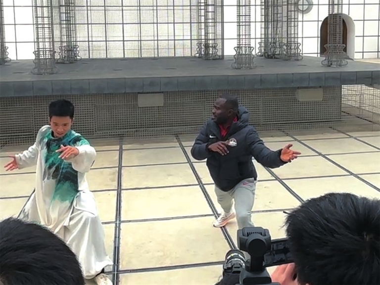 第一站,俱樂部在參觀完太極拳表演后,馬亞、卡多索、邁達(dá)納、阿奇姆彭四位外援一字排開,在老師身后“擺開架勢”,一輪太極拳打完,在首輪學(xué)習(xí)中“偷懶”的阿奇姆彭被留下加練一輪。表情銷魂的阿奇姆彭嘗試?yán)斫鈩幼鲄s又不能完全領(lǐng)悟要領(lǐng),本就具備“搞笑屬性”的阿奇姆彭點燃了全場的歡樂氛圍。
