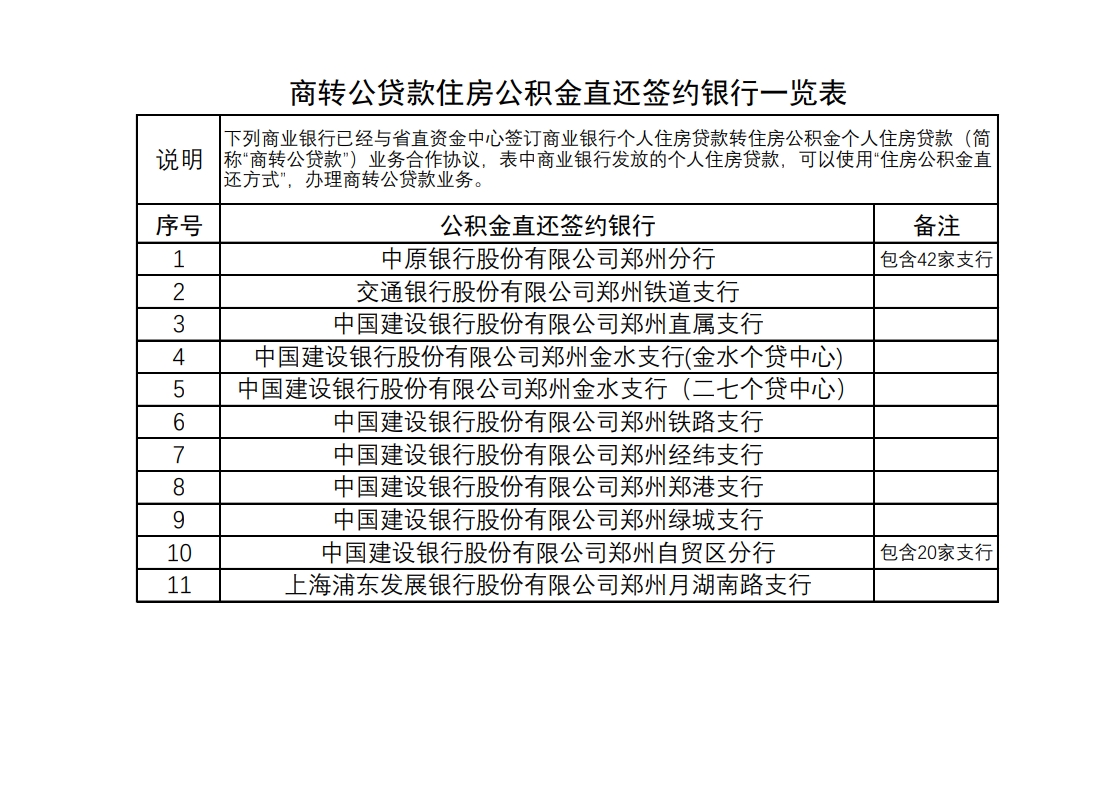 此次公布的直還簽約銀行一覽表中,具體包含:中原銀行股份有限公司鄭州分行(包含42家支行)、交通銀行股份有限公司鄭州鐵道支行、中國建設銀行股份有限公司鄭州直屬支行、中國建設銀行股份有限公司鄭州金水支行(金水個貸中心)、中國建設銀行股份有限公司鄭州金水支行(二七個貸中心)、中國建設銀行股份有限公司鄭州鐵路支行、中國建設銀行股份有限公司鄭州經緯支行、中國建設銀行股份有限公司鄭州鄭港支行、中國建設銀行股份有限公司鄭州綠城支行、中國建設銀行股份有限公司鄭州自貿區(qū)分行(包含20家支行)、上海浦東發(fā)展銀行股份有限公司鄭州月湖南路支行。