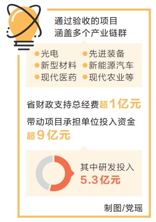 此次通過驗收的項目涵蓋光電、先進裝備、新型材料、新能源汽車、現(xiàn)代醫(yī)藥、現(xiàn)代農(nóng)業(yè)等多個產(chǎn)業(yè)鏈群,省財政支持總經(jīng)費超1億元,帶動項目承擔單位投入資金超9億元,其中研發(fā)投入5.3億元,財政資金撬動效應(yīng)顯著,一批標志性成果脫穎而出。