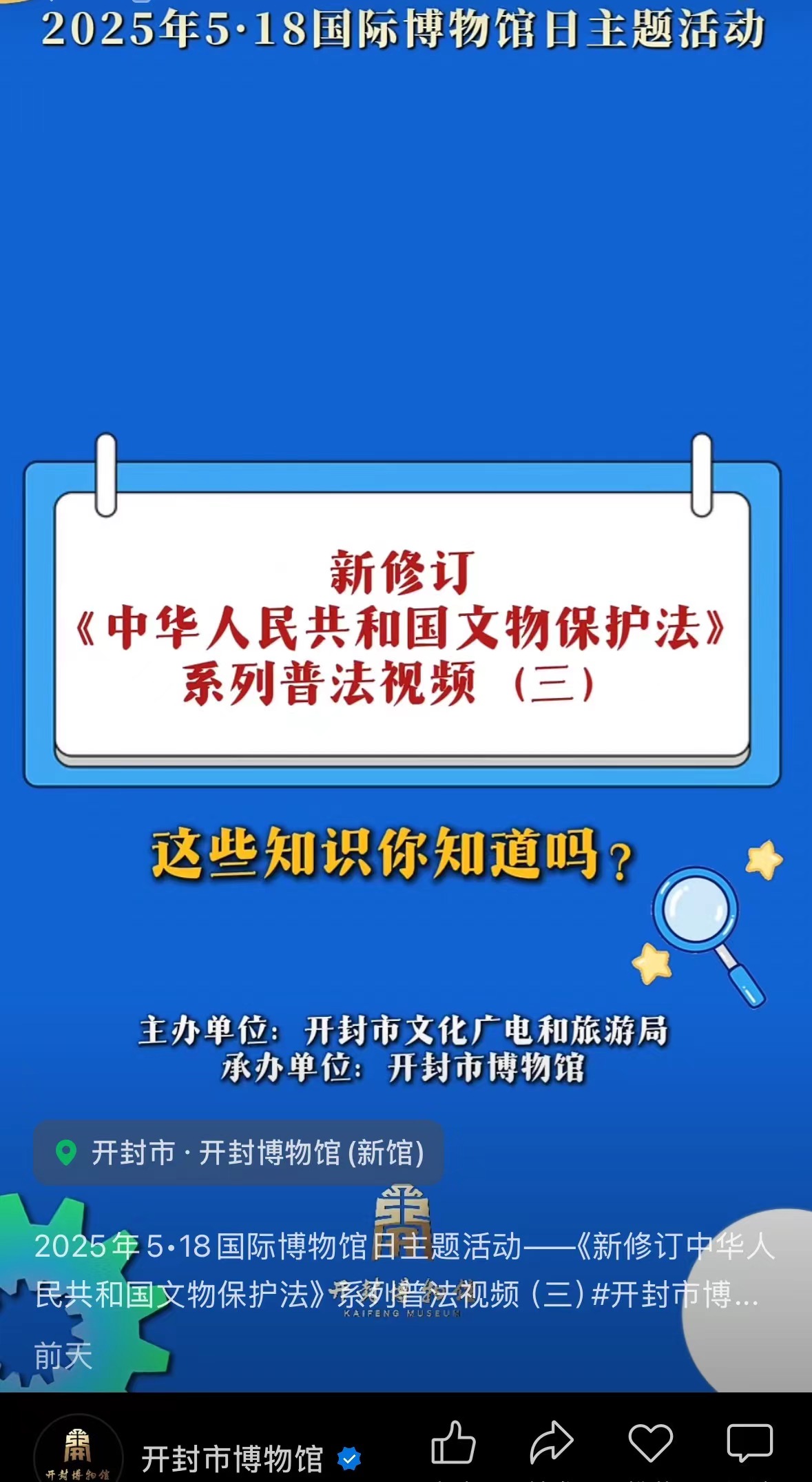 “有法可依,有法必依。”法律,是保障文物安全的基礎(chǔ),2025年3月1日,《新修訂中華人民共和國文物法》正式施行,這也是《文物保護(hù)法》自1982年頒布實(shí)施以來,第二次全面修訂。開封市博物館精心打造10期科普短視頻,自5月6日起通過館方視頻號(hào)、抖音賬號(hào)發(fā)布推廣,每期聚焦不同要點(diǎn),生動(dòng)講解文物保護(hù)法知識(shí),助力全民提升文物保護(hù)意識(shí)。