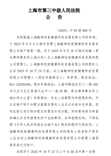 【大河財(cái)立方 記者 吳海舒】 10月23日上午,上海市第三中級(jí)人民法院就上海酪神世家健康科技發(fā)展有限公司(以下簡(jiǎn)稱(chēng)酪神世家)破產(chǎn)清算一案召開(kāi)第一次債權(quán)人會(huì)議。