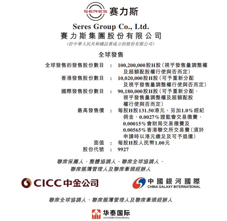 賽力斯計(jì)劃在本次招股基礎(chǔ)發(fā)行規(guī)模1.002億股H股,按每股最高131.50港元發(fā)行價(jià)計(jì)算,預(yù)計(jì)公司募資凈額可達(dá)129.249億港元。如成功上市,賽力斯將打破奇瑞不久前創(chuàng)造的紀(jì)錄,成