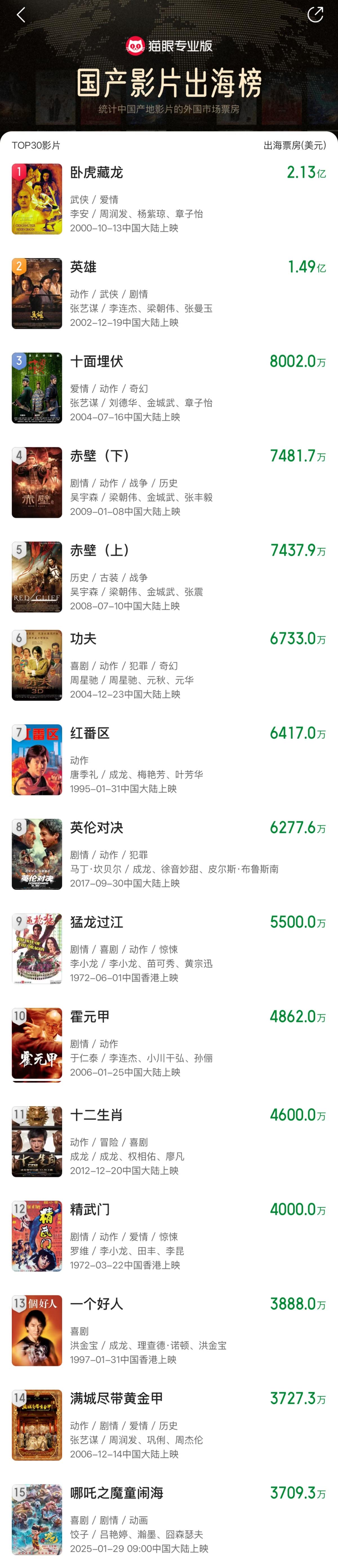據(jù)網(wǎng)絡(luò)平臺數(shù)據(jù),《哪吒之魔童鬧?!烦龊F狈砍?709萬美元,進(jìn)入國產(chǎn)影片出海榜top15!