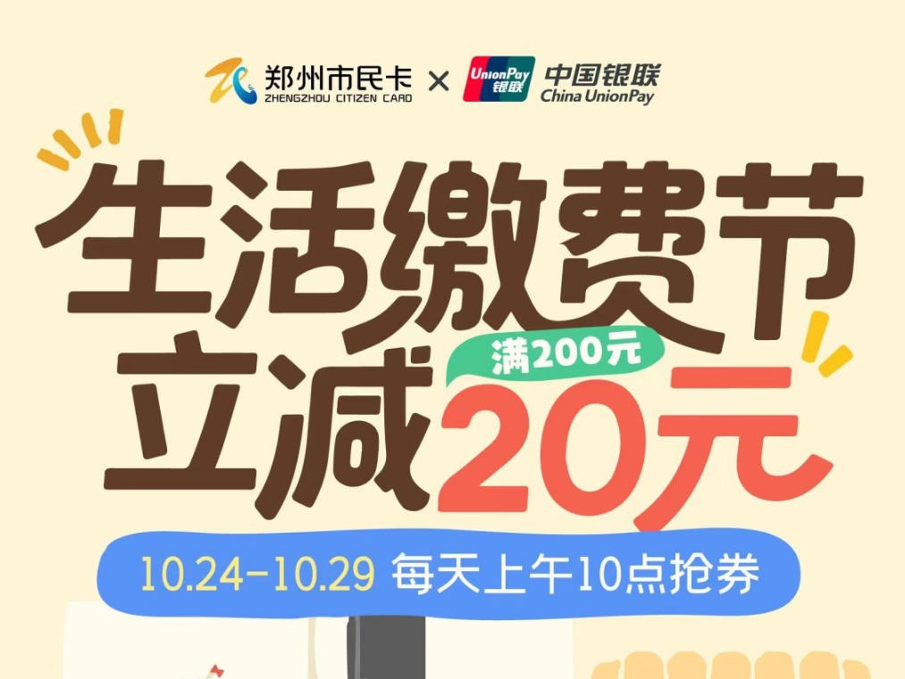 10月23日,記者從鄭州市人社局了解到,明日起(10月24日)起至10月29日,鄭州社???市民卡)將聯(lián)合中國銀聯(lián)開展“2025年生活繳費(fèi)節(jié)”活動(dòng)。活動(dòng)期間,每天上午10點(diǎn)通過鄭州市民